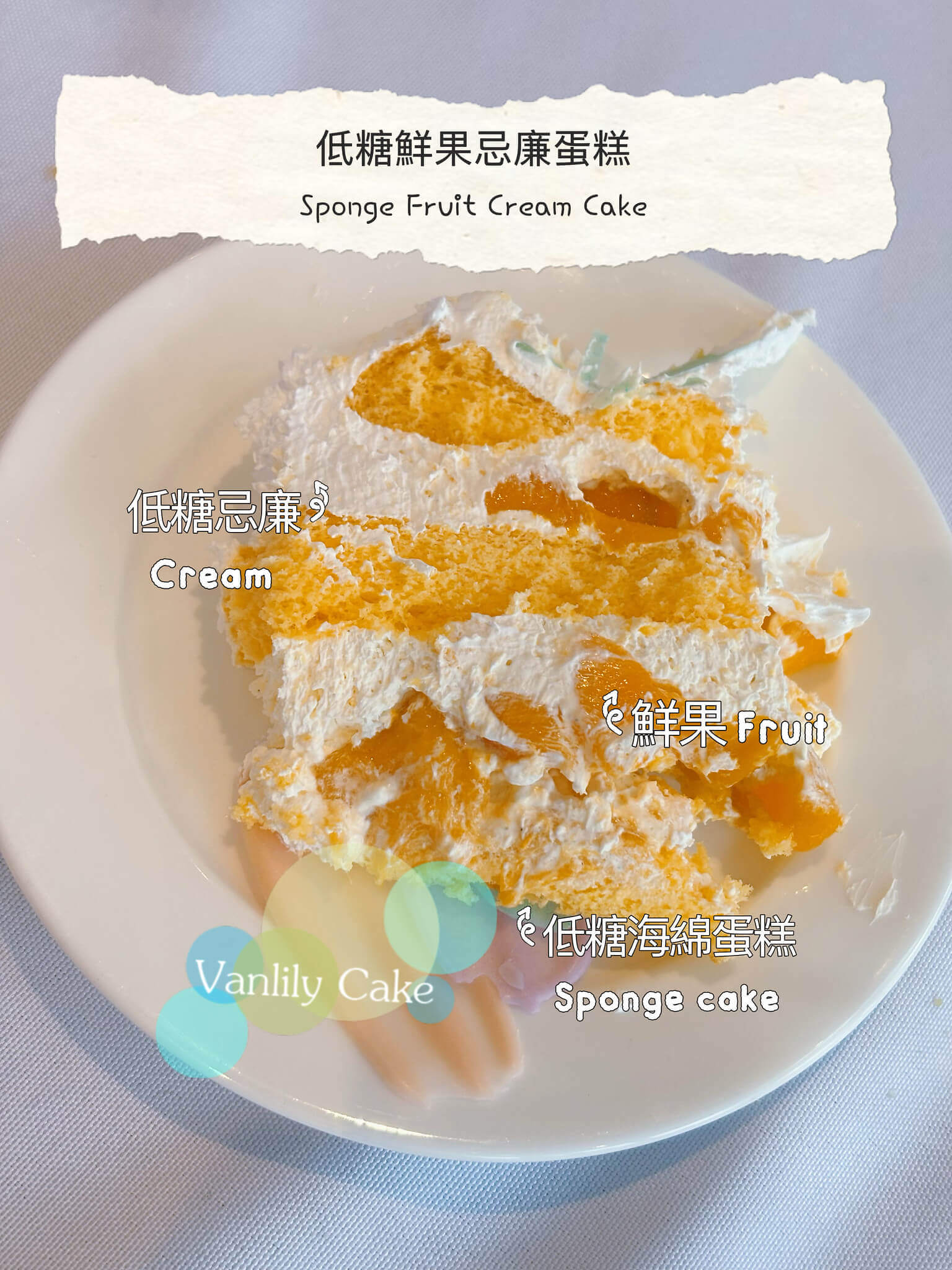 蛋糕成份:麵粉、蛋、澳洲低升糖蔗糖、菜油、粟粉、鮮果、忌廉 (含糖, 奶)、雲呢拿籽
