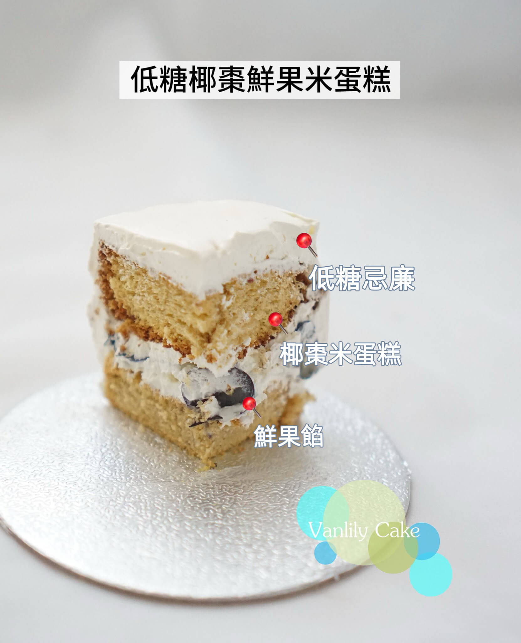 蛋糕成份:米粉、蛋、椰棗、菜油、粟粉、鮮果、忌廉、雲呢拿籽