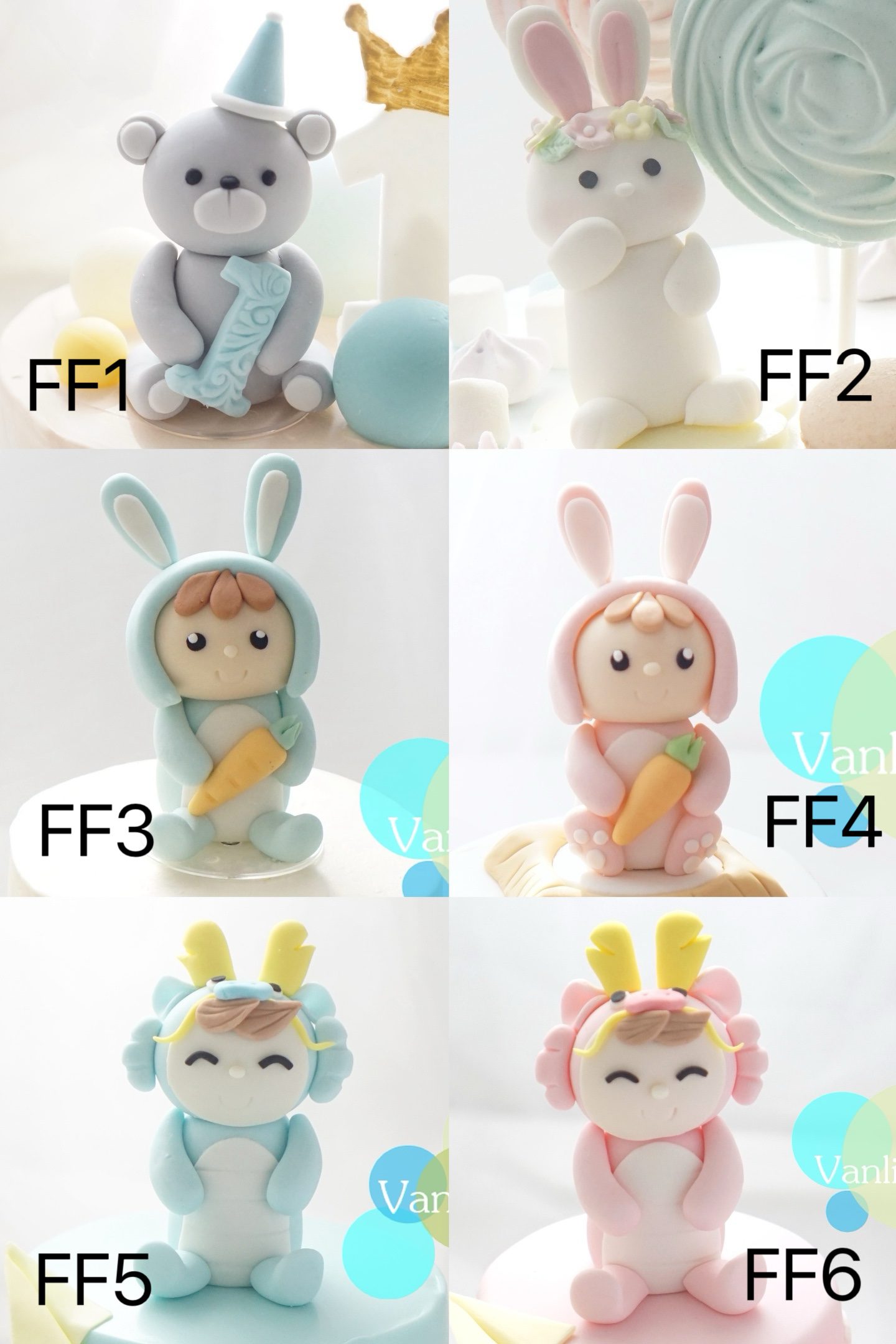 FF1 小熊, FF2 小兔, FF3 紅蘿蔔小男兔, FF4 紅蘿蔔小女兔, FF5 小龍仔, FF6 小龍女, 來相訂造公仔 Tailormade figure